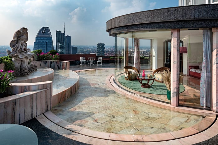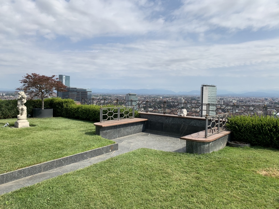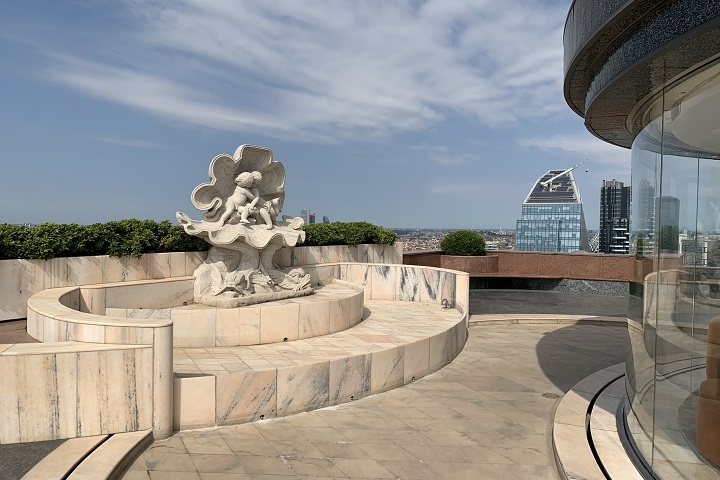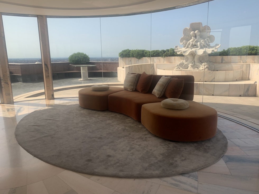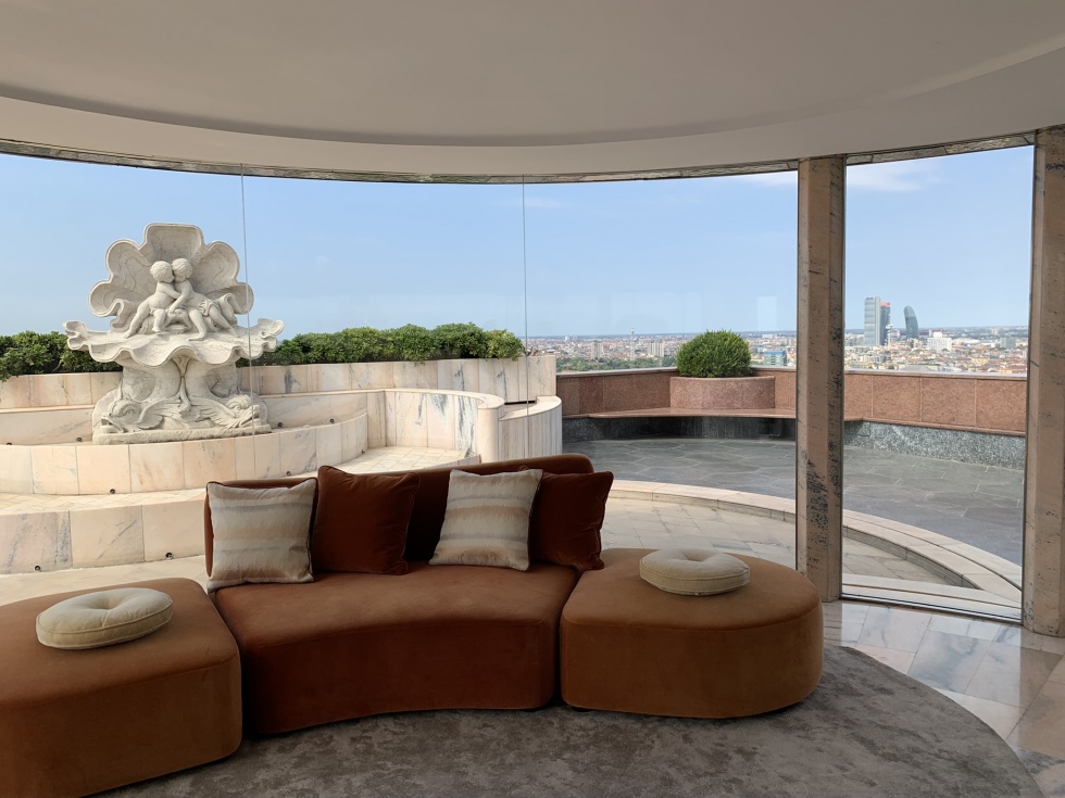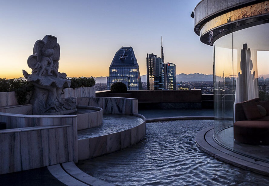 Lo spazio outdoor si sviluppa su circa 400 mq con vista sulla città, leggibile da ogni angolazione, senza interruzioni. A rendere l’area ancora più distintiva contribuiscono un giardino curato e una fontana iconica degli anni Cinquanta in marmo rosa di Candoglia, lo stesso materiale del Duomo. La location si presta in modo particolare a cene business, meeting aziendali, attivazioni di street marketing e press day, risultando una scelta da considerare per eventi che cercano rappresentanza e visione.